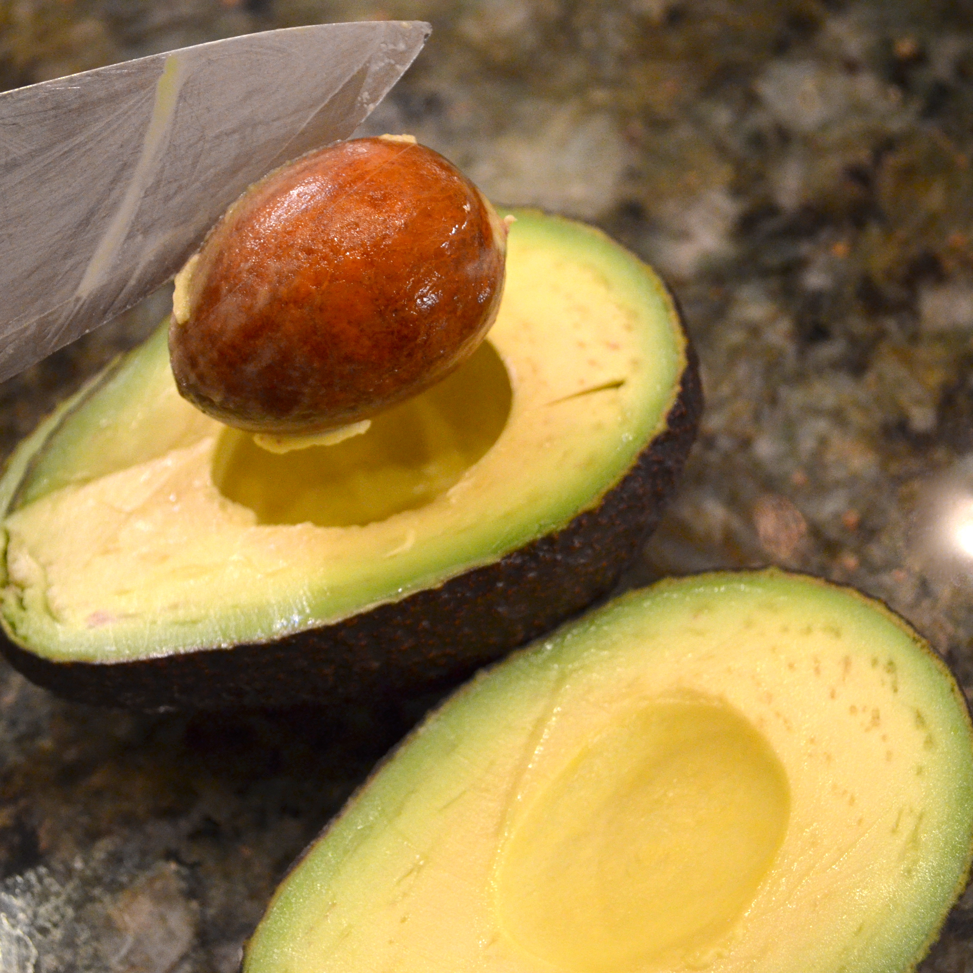 So, without further adieu, here is how I prepare my guacamole. Start with two ripe Hass avocados. The Hass have the creamiest texture. There is a very fine line between a ripe avocado and an overripe avocado. The skin of a ripe Hass will be turning from bright green to a dark brown colored skin, and will have a soft but not mushy feel under the skin. It’s an acquired feel:) Slice the avocados in half and, using your knife, remove the seed.