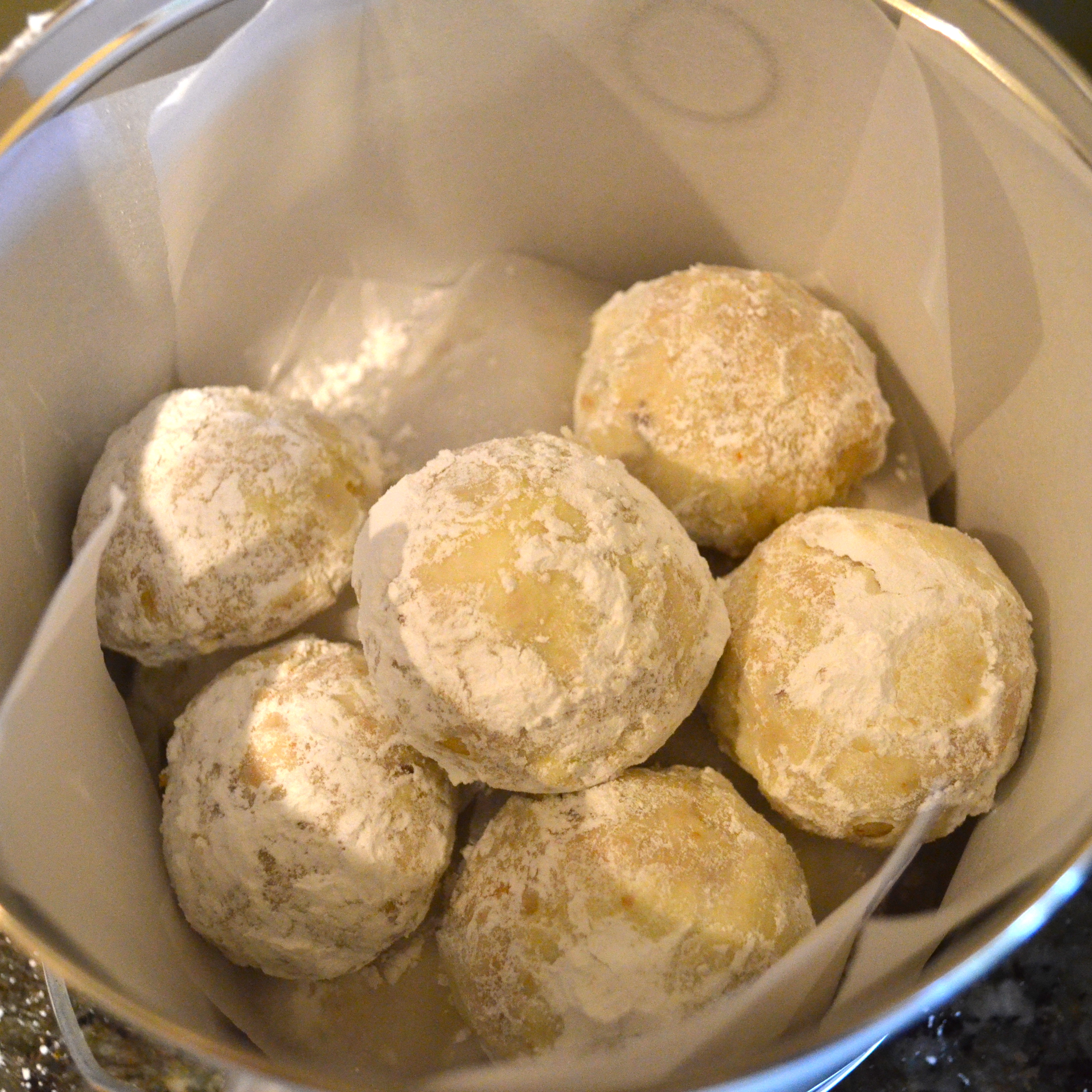 Place a generous amount of confectioner’ sugar in a low-sided bowl. While the cookies are warm, roll them in the sugar. Let the cookies cool and roll them in the sugar again for a nice generous coating. After all, this is what makes them “snowballs”.