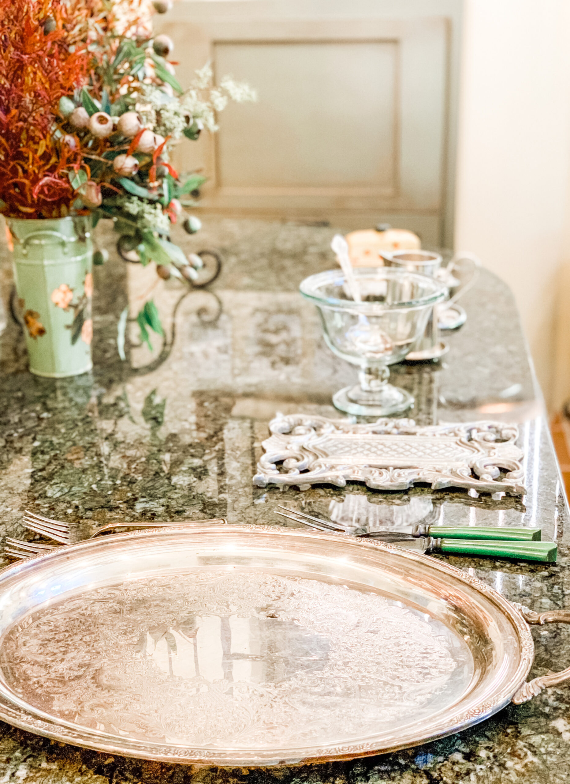 I then placed trivets, serving platters and utensils on the buffet, avoiding a last minute search for these items.