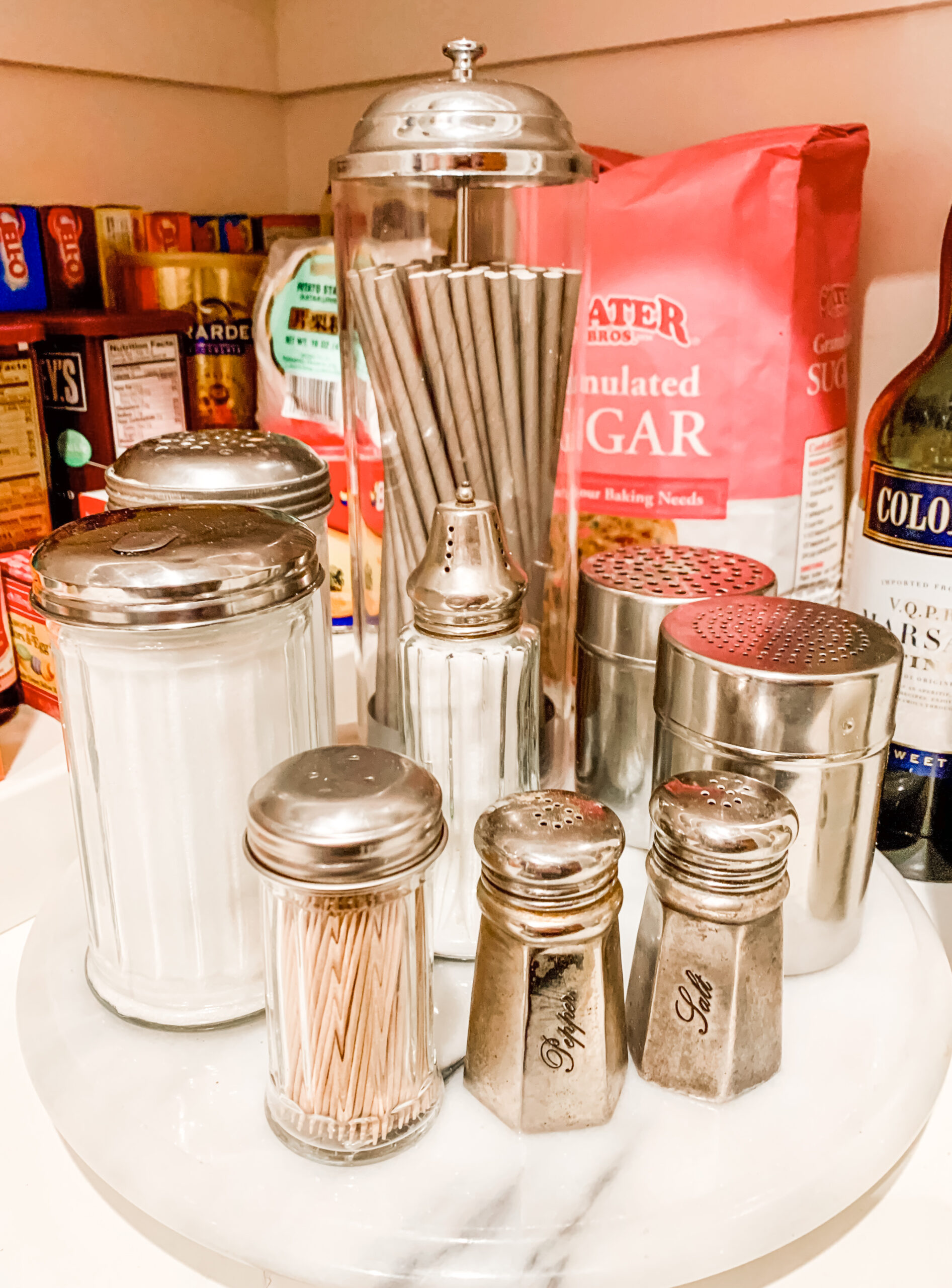 As you can see I utilize a pretty marble Lazy Susan for some specific items that I use frequently: salt & pepper, shakers of granulated sugar and powdered sugar, shakers for flour and semolina flour for pizza making, a toothpick dispenser and straws.